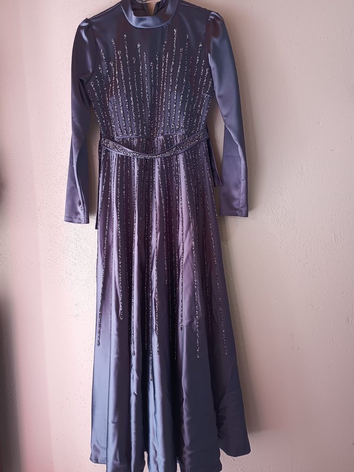 Uzun kollu, yüksek yakalı mor abiye elbise, işlemeli detaylara sahip. Düz kesim ve drapeli tasarımıyla düğünler için uygun. ✨ Bir kez giyildi hiç bir sorunu yok
