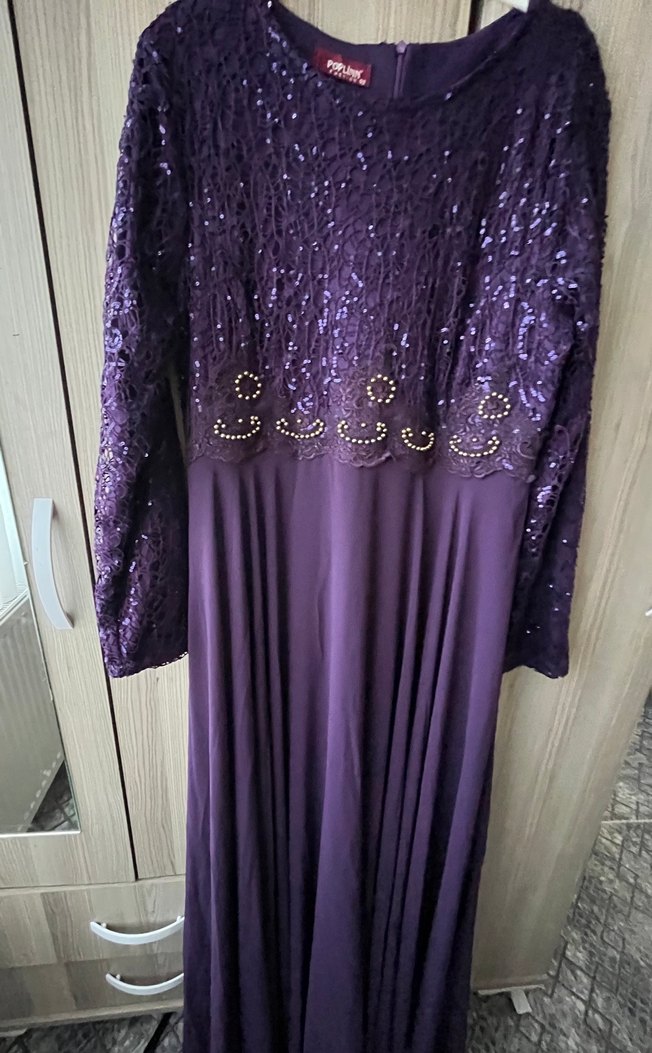 Uzun kollu, işlemeli ve drapeli, bol kesimli mor abiye elbise. Düğün ve özel davetler için uygundur.