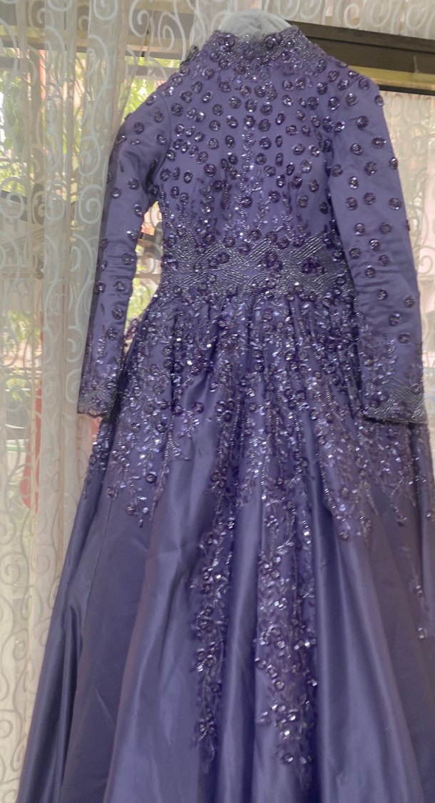Uzun kollu, vücuda oturan mor elbise, işlemeli boncuk detayları ve kesimli yaka ile şık düğünler için uygundur.