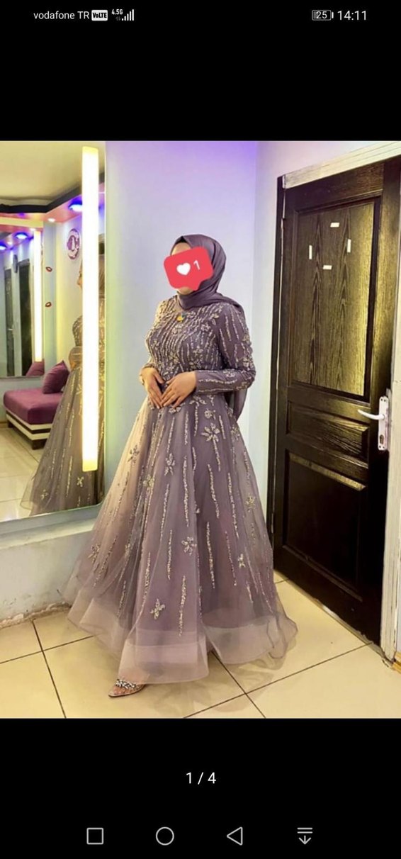 Bu mor-gri tonlarında, yüksek yakalı ve uzun kollu, işlemeli ve drapeli uzun, dar kesim abiye elbise. Düğünler için uygundur. birkaç defa giyildi çok iyi durumda ağır ve şık bir model.