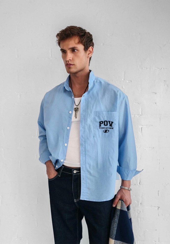 Uzun Kollu İşlemeli Oversize Gömlek -ürün sıfır etiketli duruyor.