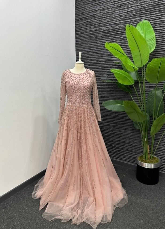 Uzun kollu ve tekne yaka tasarıma sahip pembe abiye elbise, boncuk işlemeli ve nakış desenlidir. Düzenli kesimi ve modern stiliyle şık bir seçenektir.