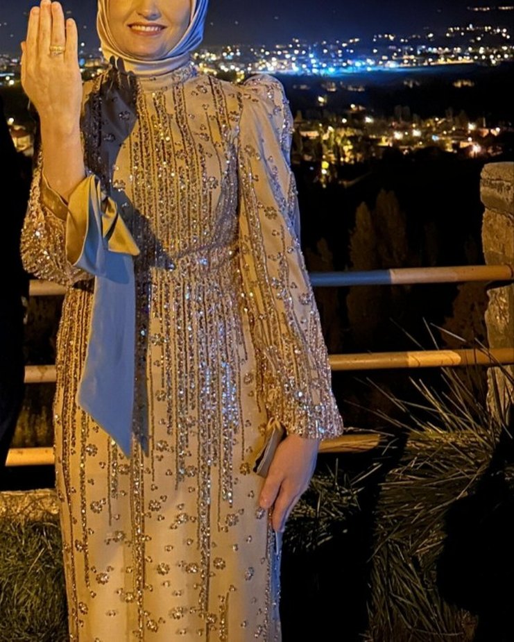 Uzun kollu, yüksek yakalı ve işlemeli boncuk detaylı gold abiye elbise, zarif ve göz alıcı bir görünüm sunar. ✨ (şal ve eşarp dahil)