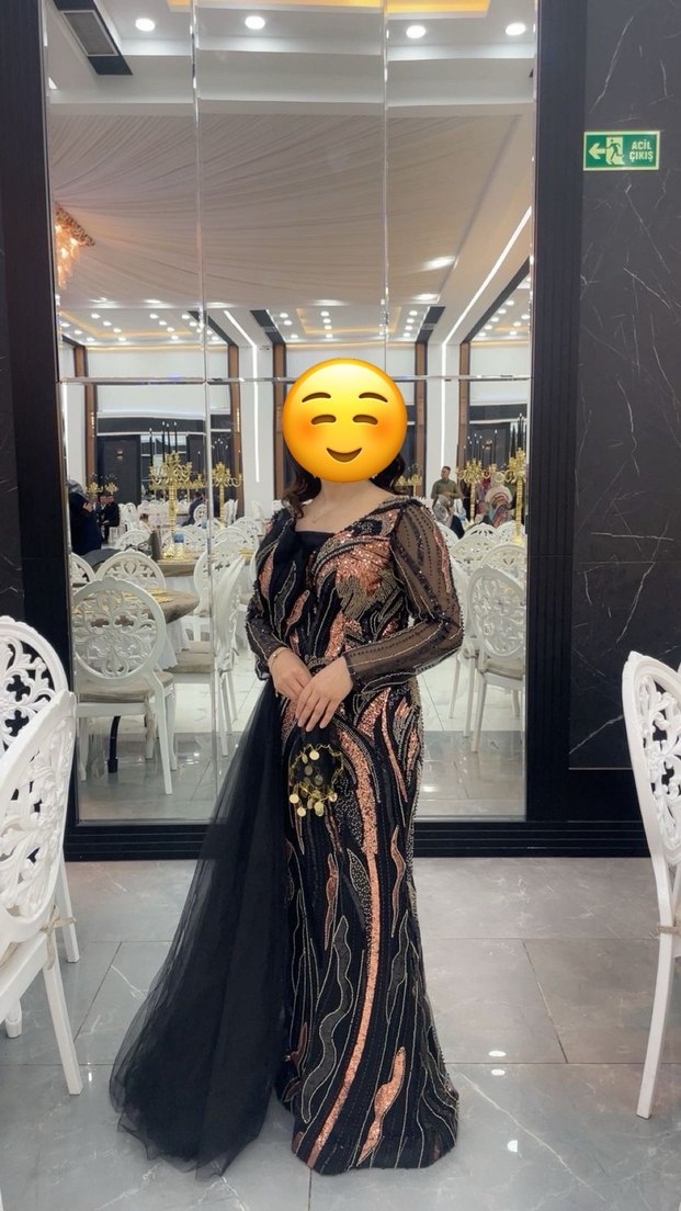 Bir kez giyildi. V yaka ve uzun kollu, işlemeli ve payetli detaylarla süslenmiş siyah uzun abiye elbise, klasik şıklık için uygundur. ✨