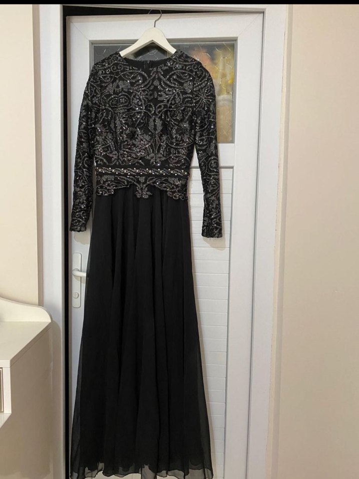 Uzun Kollu İşlemeli Siyah Abiye Elbise