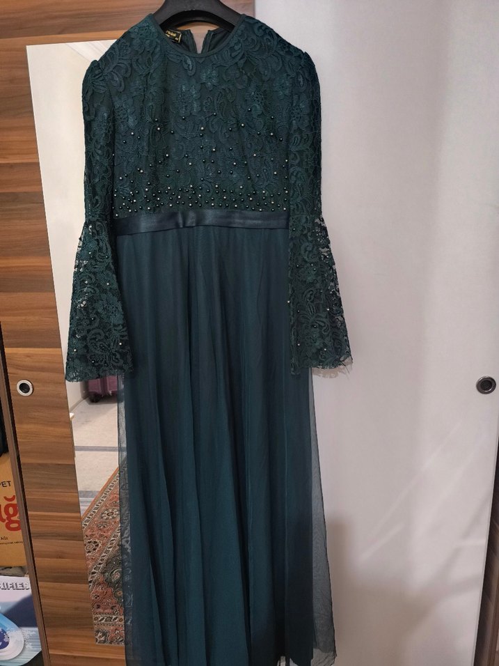 Uzun Kollu İşlemeli Yeşil Abiye Elbise