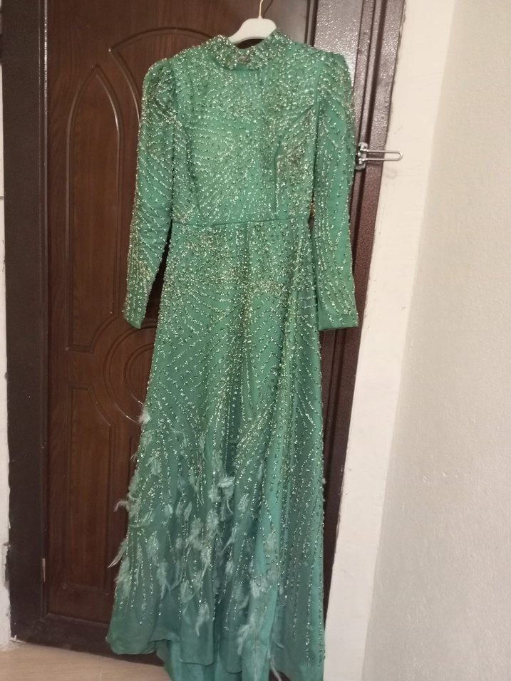Uzun Kollu İşlemeli Yeşil Abiye Elbise