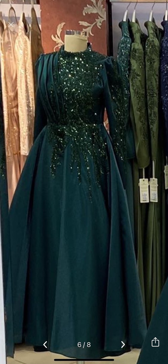 Uzun kollu, V yakalı, işlemeli koyu yeşil abiye elbise. Drapeli tasarımı ve düzenli kesimiyle düğünler için modern klasik bir tercih. Sadece 1 kere giydim tarlatanı da var diktirip o şekil de kullanablirsnz