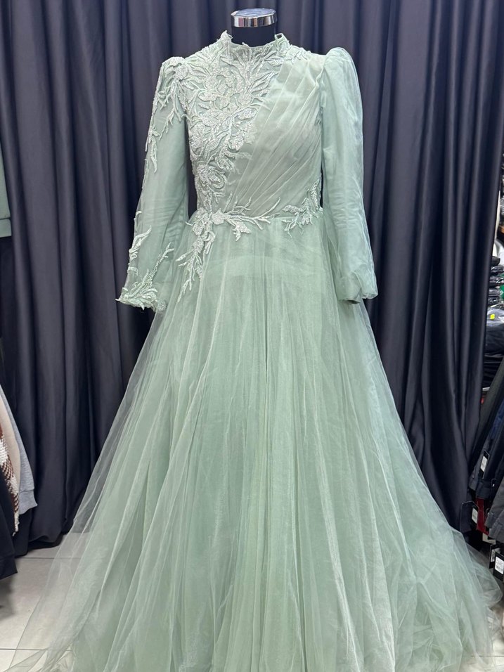 Uzun kollu, kayık yaka ve işlemeli detaylara sahip açık yeşil kadın abiye elbise. Drapeli tasarımı, modern klasik ve şık bir görünüm sunar. 38 ve 42 bedene kadar arkası iplikli olduğu için uygundur. ŞAL VE TARLATAN ALAN KİŞİYE HEDİYEDİR