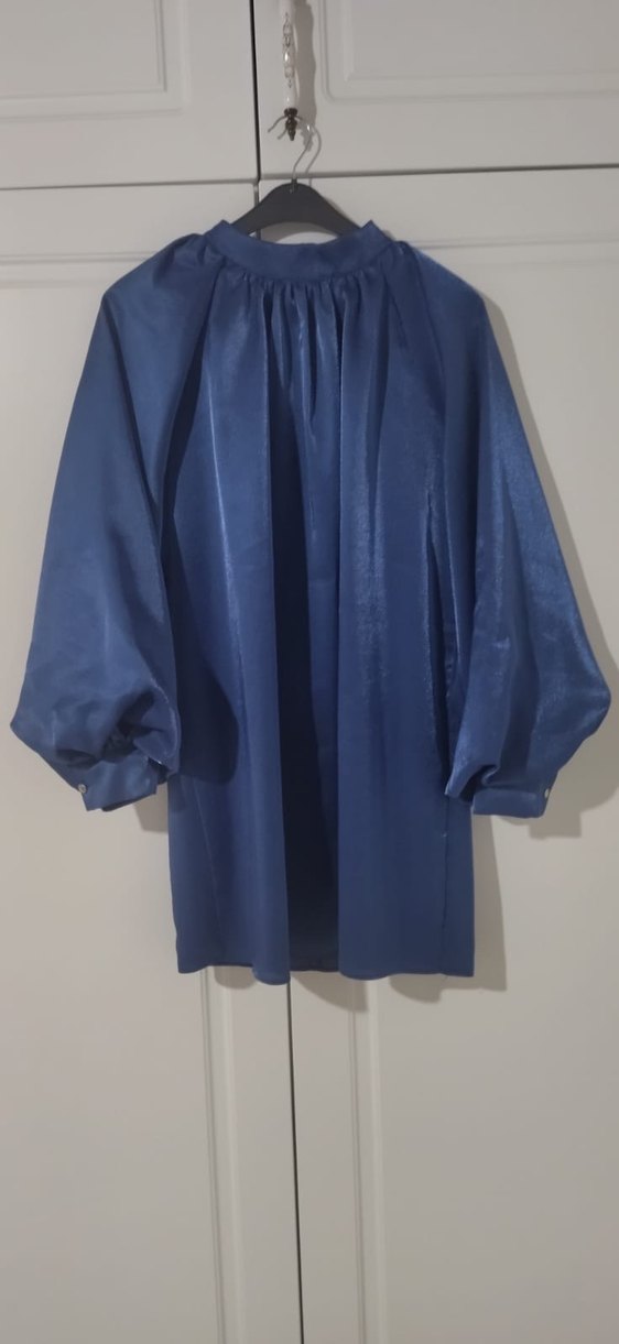 Uzun boy, parlak mavi kumaştan, uzun ve bol kollu, desen içermeyen Paris normcore tarzında kadın elbisesi.