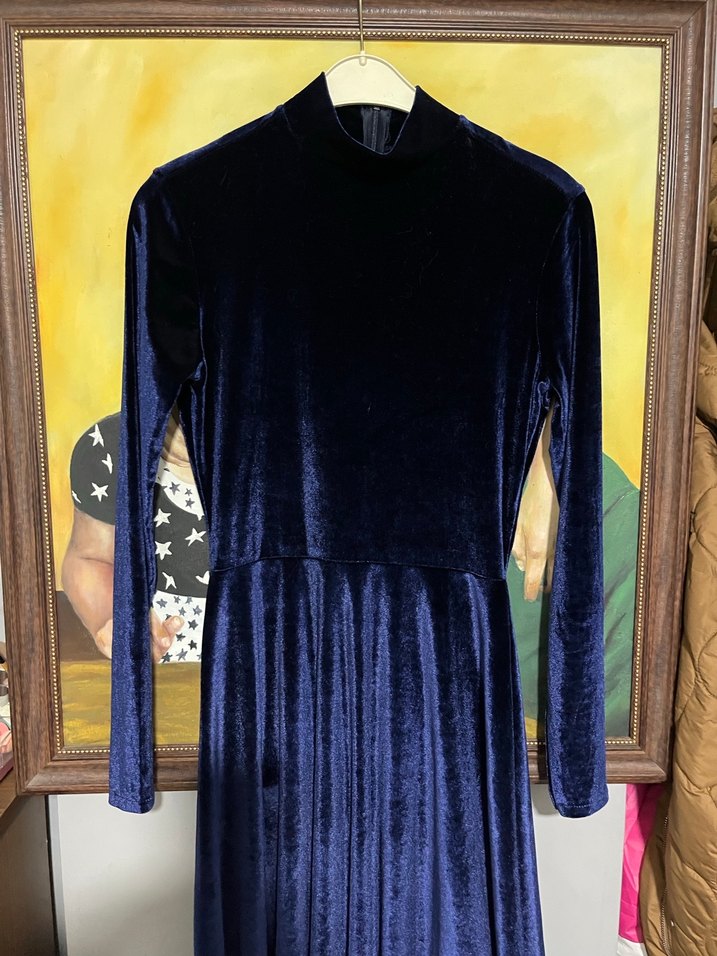 Uzun Kollu kadife Lacivert Kadın Elbise bir kez giyildi