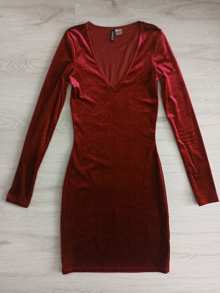 Kadife kumaştan yapılmış, derin V yakalı ve uzun kollu, vücuda oturan mini elbise. Rengi fotoğraflarda göründüğünden daha vişne. Oturunca popoya denk gelen kısmı biraz deforme olmuş herhalde (son fotoğraf). Fiyatı ona göre ayarladım.