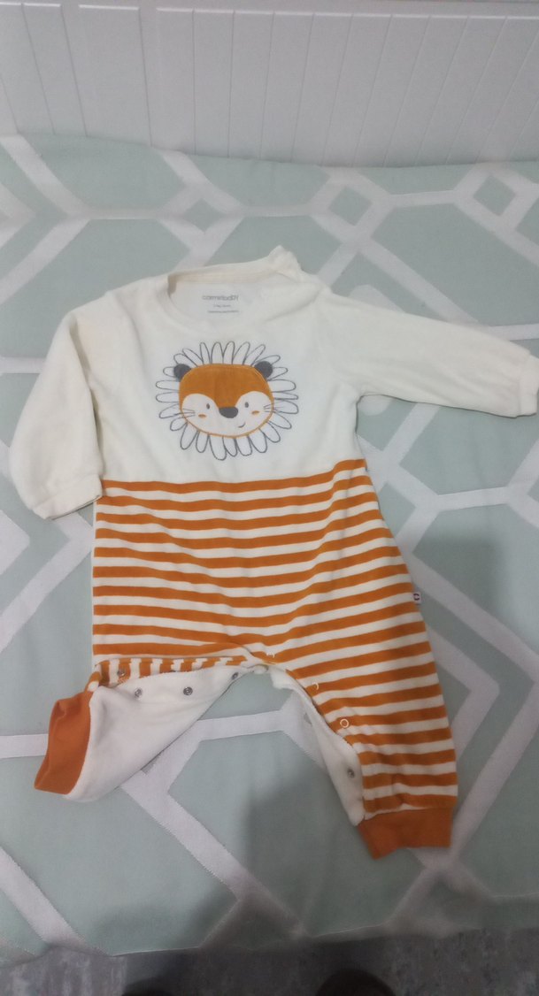 Renkli erkek bebek tulumu, uzun kollu ve bisiklet yaka. Yumuşak ve sıcak dokulu kadife kumaştan, göğsünde sevimli aslan baskısı bulunur. Alt kısmı turuncu-beyaz çizgili, çıtçıtlıdır.