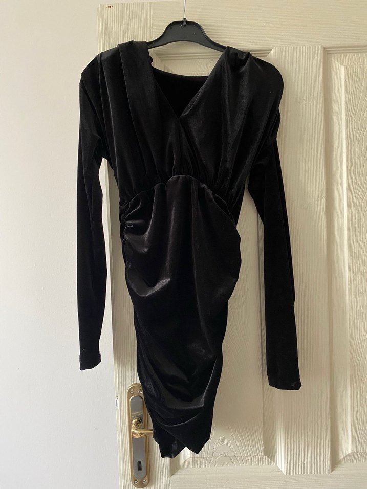 Uzun Kollu kadife Siyah Drapeli Midi Elbise