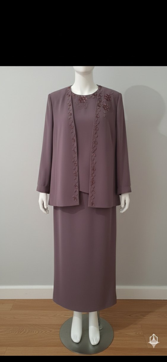 Özel gün anne abiye kıyafeti. 3 parçadan oluşuyor, uzun etek, bluz ve ceket takım. Bluz ve ceketin yaka kısmında boncuk işlemesi mevcut. Etek arkasında kapalı pileli yırtmacı vardır. 52 bedendir. Şeffaf kıyafet poşeti içinde gönderim sağlanacaktır. Hiç bir defosu veya yırtığı yoktur, tertemiz bir kıyafettir. Mürdüm rengindedir.