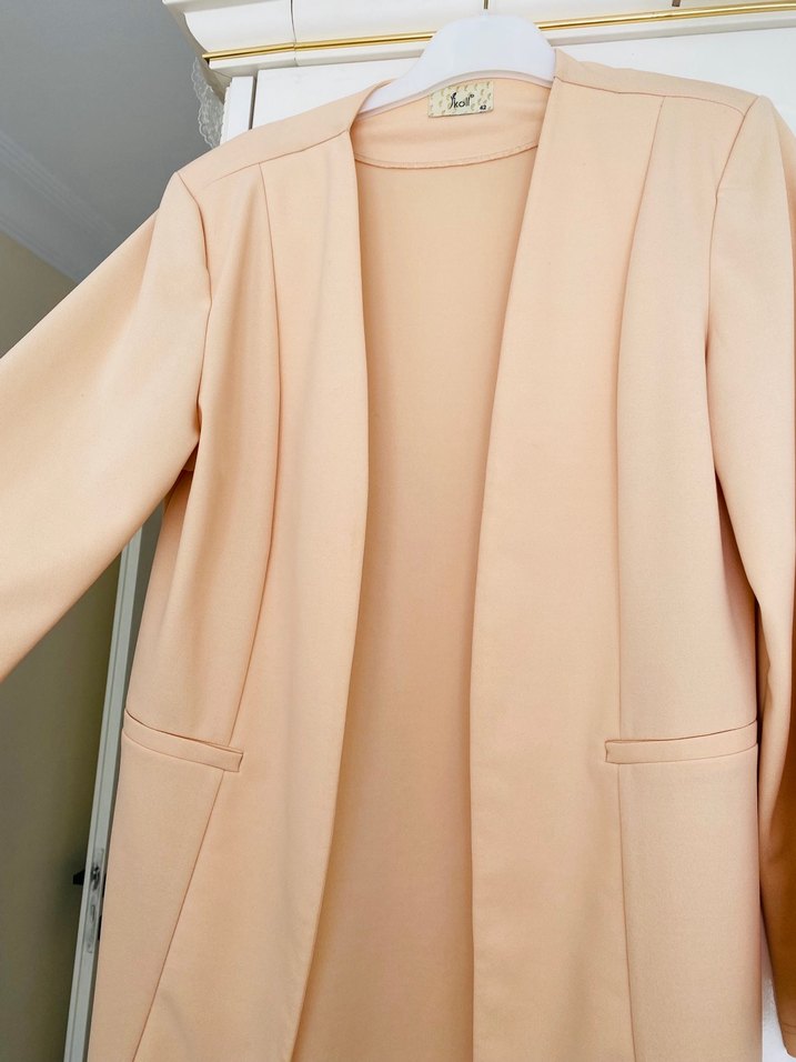 Pudra pembesi renkte, düğmeli ve uzun kollu kadın blazer cekettir. Sentetik kumaştan yapılmış, klasik ve şık duruş sağlar. Ofis için uygundur, desen içermez. Bir kere giyildi