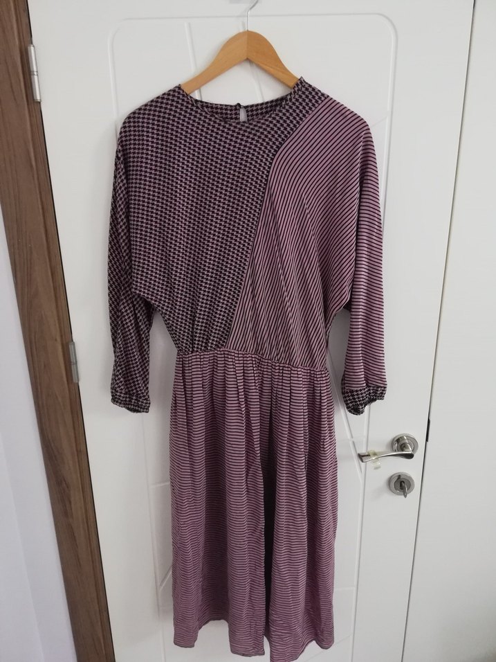 Kadınlar için uzun kollu, bol kesim, pile detaylı ve V yakalı mor tonlarında sentetik kumaştan günlük kullanıma uygun elbise.