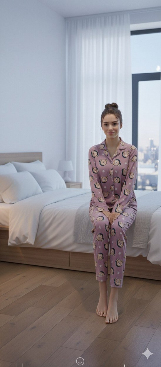 Pembe tonlarında, uzun kollu ve bol kesim kadın pijama takımı. Midi boy ve neşeli maymun desenli, rahat ve konforlu.