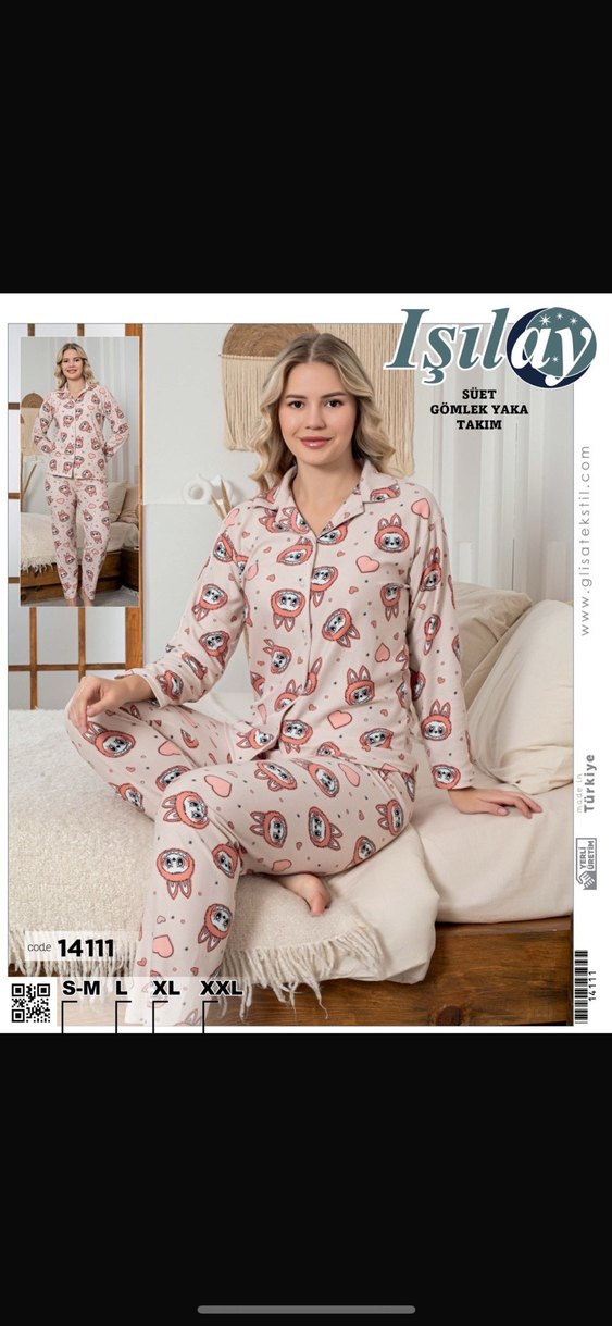 Yumuşak Süet kumaştan, uzun kollu , bol kesim toz pembe pijama takımı. Yakalı ve düğmeli ön detaylı.