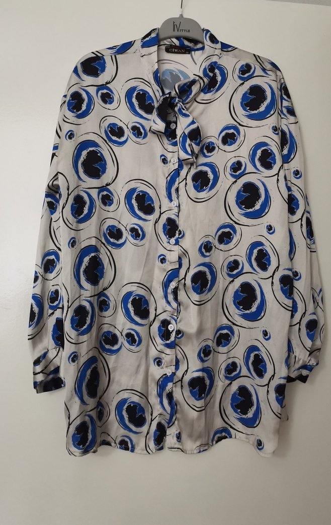 Mavi desenli düğmeli, uzun kollu, yakadan bağlamalı bol kesim kadın gömleği. Günlük kullanım için uygun sokak stili gömlek.