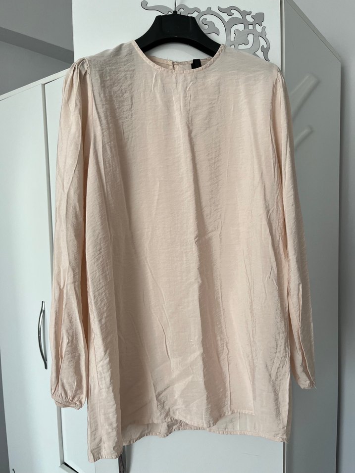 Pudra pembe renkte, uzun kollu, ince kumaştan üretilmiş, salaş ve drapeli tasarıma sahip kadın tunik Minimalist normcore stil için uygun.