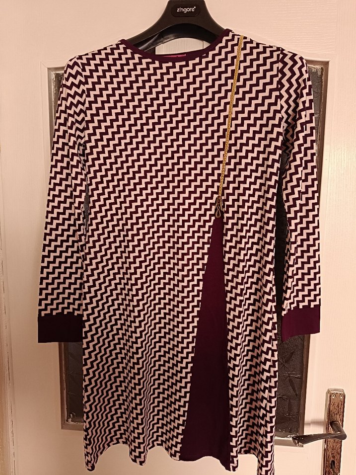 Mürdüm renkte, uzun kollu, bisiklet yakalı, baskılı ve drapeli kadın tunik, sentetik kumaştan, çağdaş tarzda.