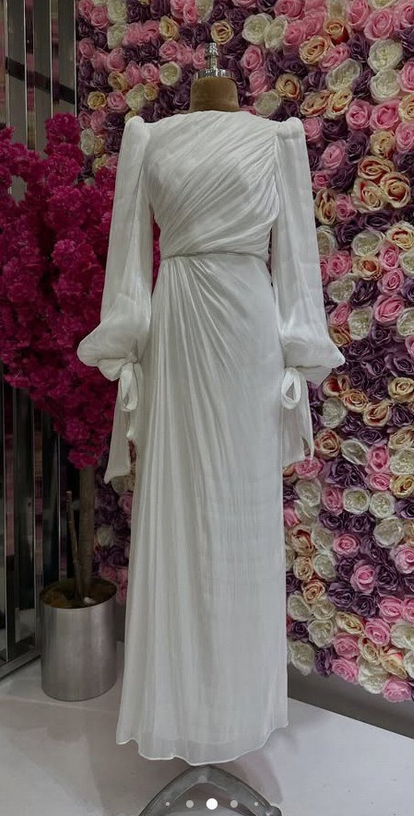 Beyaz renkte, uzun kollu ve yüksek yakalı drapeli abiye elbise. Modern klasik tarzda, bağlama desenli ve düzenli kesimlidir. Düğünler için uygundur.