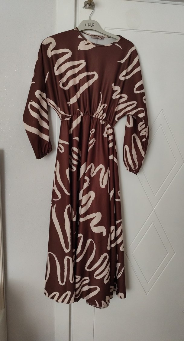 Uzun kollu, kayık yaka kahverengi elbise, bol kesim ve drapeli tasarıma sahiptir. Batik desenli, bohem tarzı yansıtır.