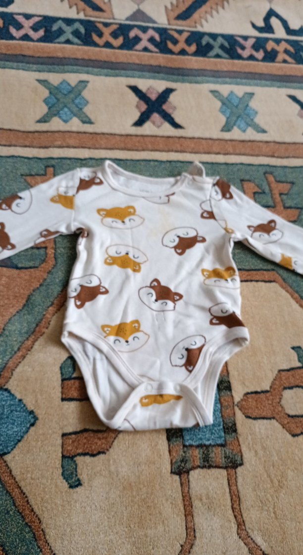 Uzun kollu, yuvarlak yakalı bebek body, yumuşak örme kumaştan, açık kahverengi ve sevimli hayvan desenleriyle. önünde hafif bir sarı lekesi vardır