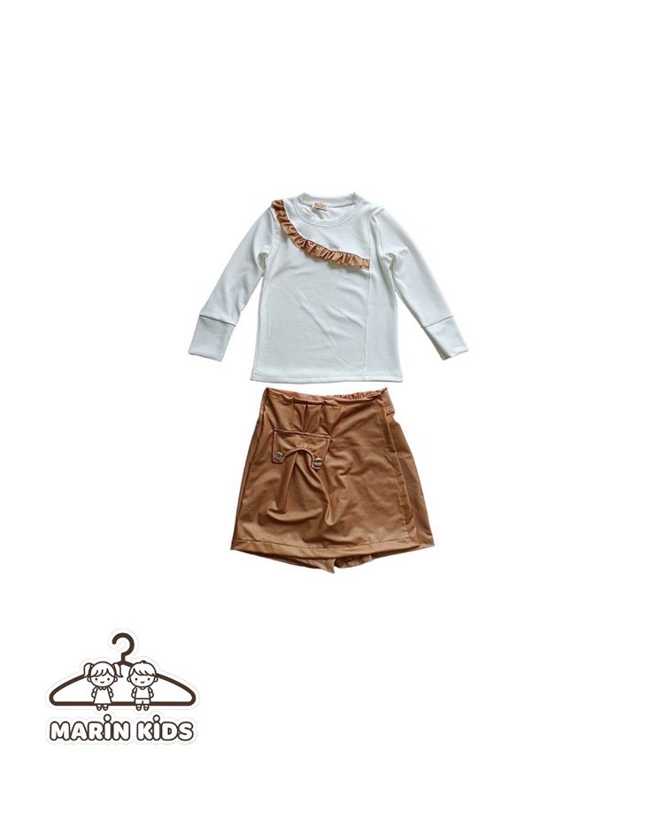 ✴️Deri etekli ikili takımımız 3-4-5-6-7 yaş seçenekleri ile stoklarımızda mevcuttur. uzun kollu beyaz üstü çapraz fırfırlı, kahverengi fiyonk detaylı şortlu bebek kız takımı. Rahat ve sade tasarım.