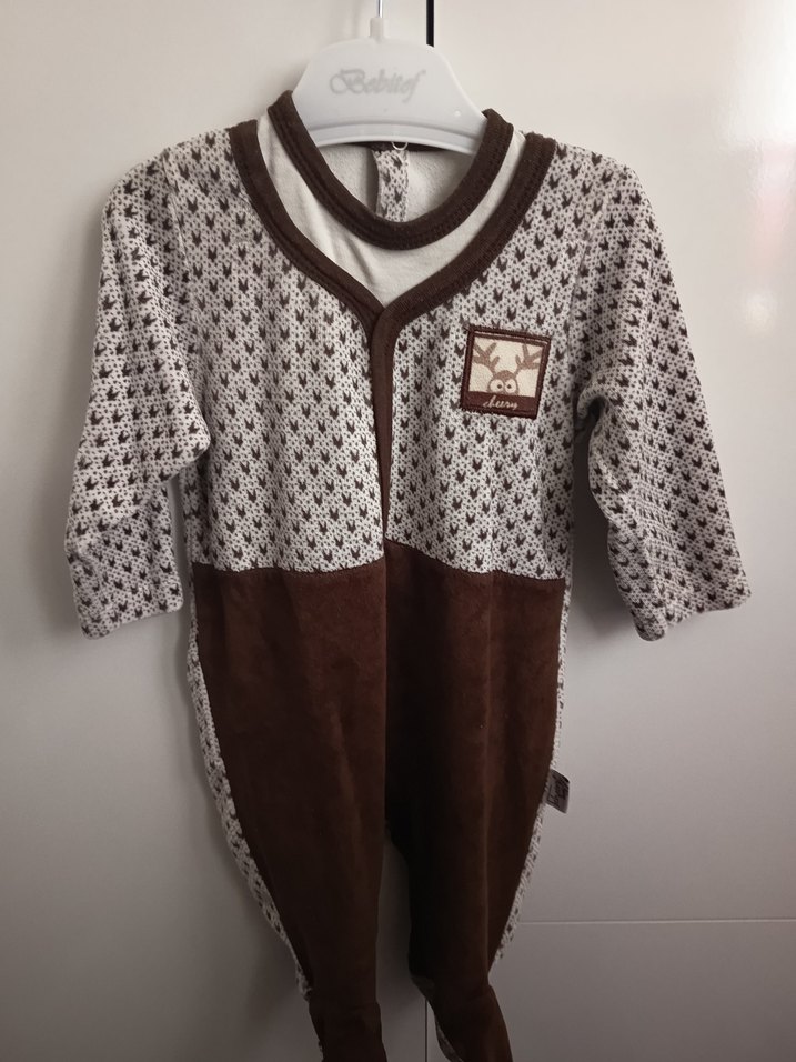 Uzun kollu, yuvarlak yakalı ve düğmeli bebek tulumu. Yumuşak ve sıcak kumaştan, nakış detaylı ve kahverengi-gri renklerde sokak stili tulum.