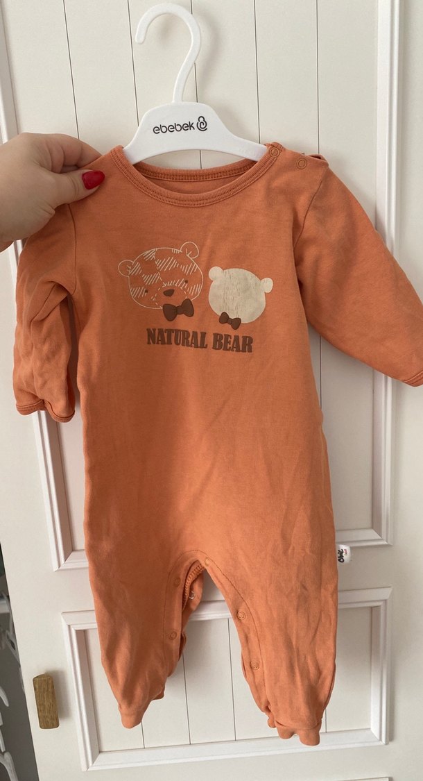 Uzun kollu, yuvarlak yakalı kahverengi bebek tulumu, yumuşak kumaştan yapılmıştır. Üzerinde "NATURAL BEAR" yazılı iki ayı baskısı bulunur. Rahat ve sade bir tarza sahiptir.