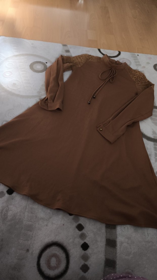 Uzun kahverengi tunik, bol kesim, drapeli detaylar ve yüksek yakaya sahiptir. Omuzlarda dantel detaylı uzun kollu, yumuşak sentetik kumaştan günlük kullanıma uygundur.