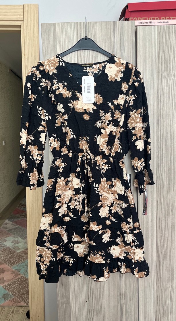 Bol kesim, uzun kollu, V yakalı bohem elbise. Kahverengi çiçek deseni ve fırfır detayları bulunur, midi boyda, yumuşak sentetik kumaştan.