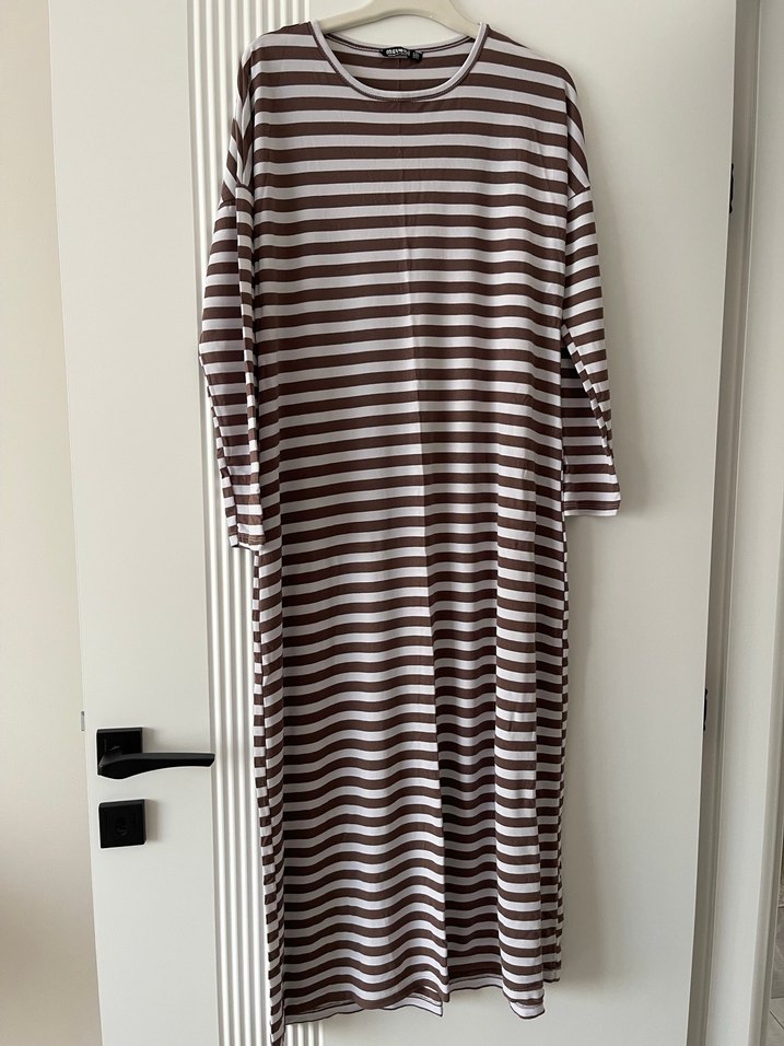 Uzun kollu, bol kesim kahverengi çizgili elbise. Penye kumaştır çok rahat çok güzel ince yazlık elbise defosu yok