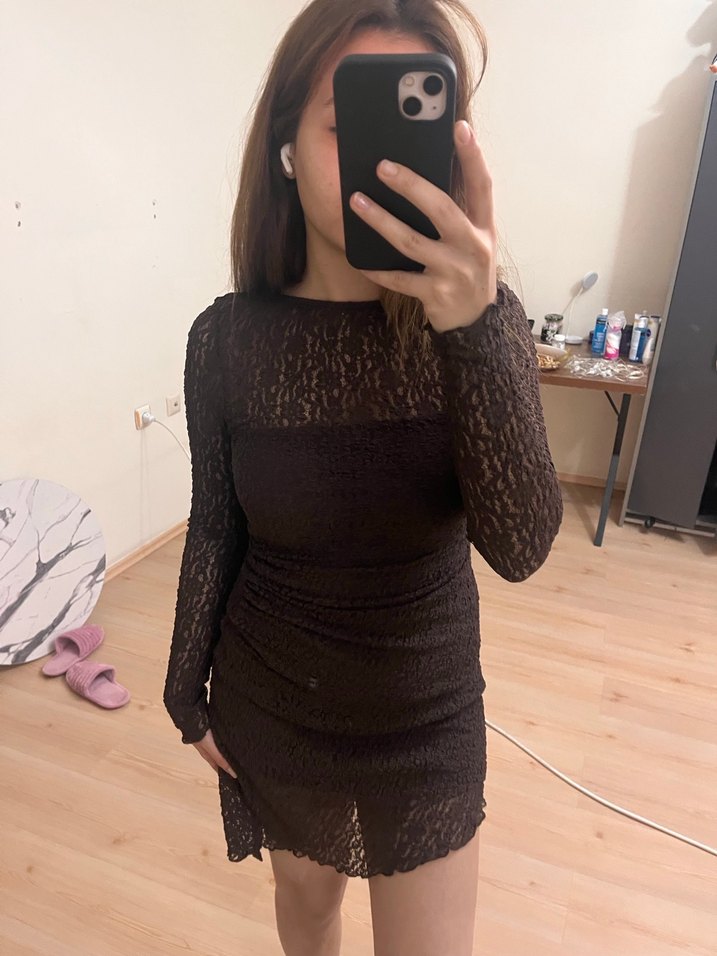 Dar kesim, uzun kollu, yüksek yakalı kahverengi dantel mini elbise.romantik akşamlar için uygun. aldım ama sonradan hiç beğenemedim