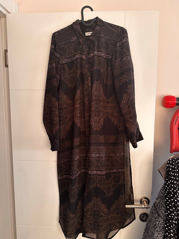 Uzun kollu, bol kesim kahverengi desenli elbise, yüksek yakalı ve ipeksi kumaştan yapılmıştır. Bohem tarzda, dökümlü bir görünüme sahiptir.