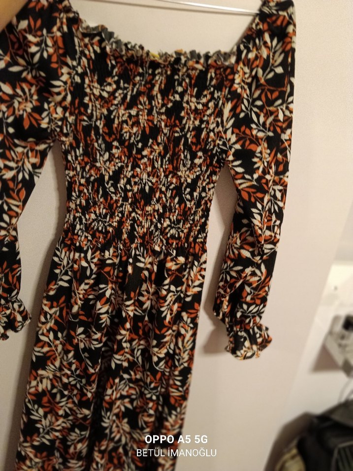 Uzun, straplez kesimli, bol ve pileli detaylı elbise. Kahverengi desenli kumaş, bohem tarzını yansıtıyor. Günlük kullanıma uygun.