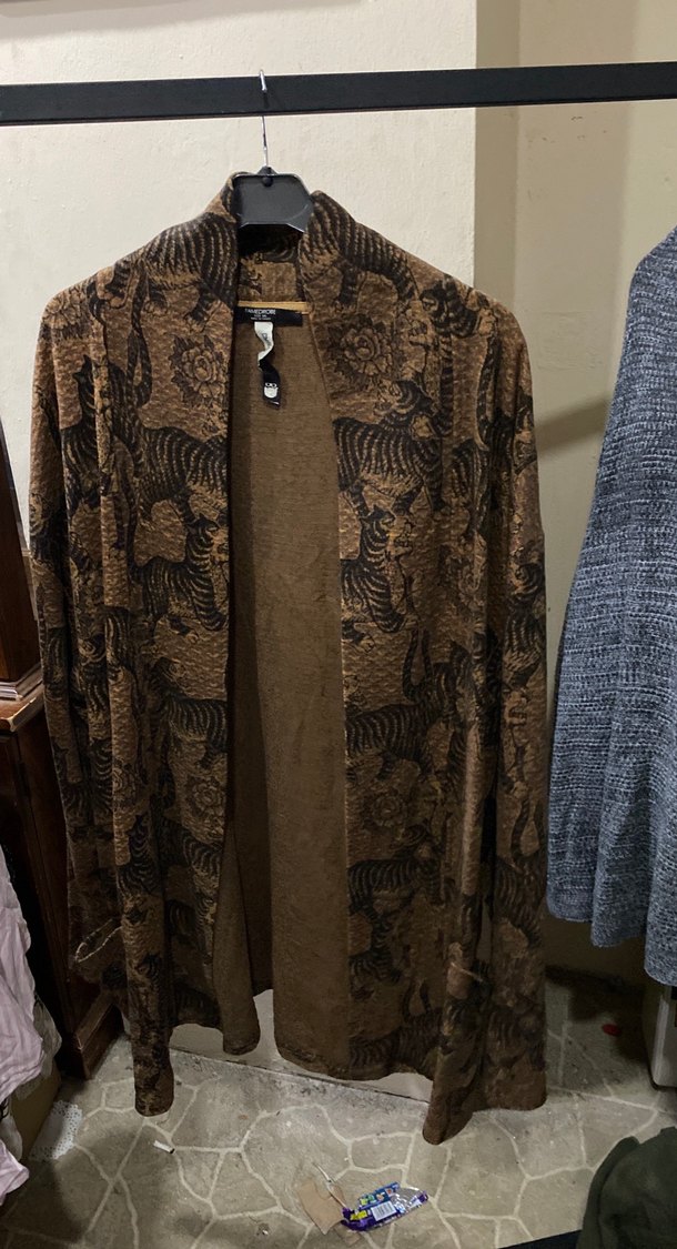 Uzun kollu, kahverengi desenli tekstil hırka. Bol kesim ve dökümlü yapısıyla bohem tarzını yansıtır. Günlük kullanıma uygundur.