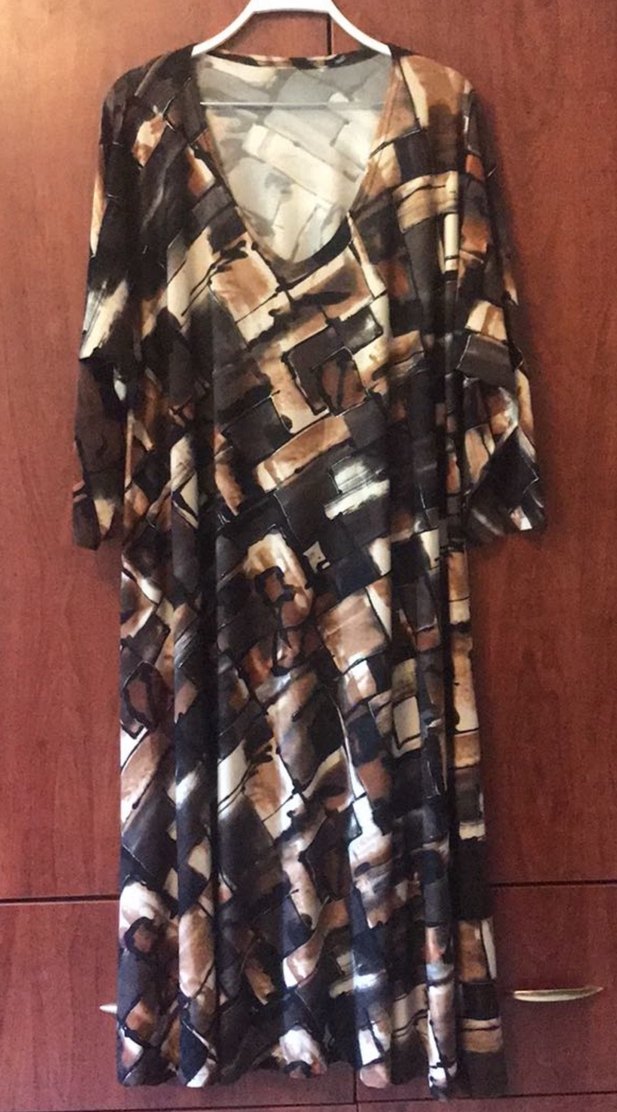 Uzun kollu, bol kesim ve yakası V biçiminde olan kahverengi desenli . Kaliteli sandy kumaş. Tiril tiril mevsimlik. Ölçüler son fotoda, 58 bedene uygun