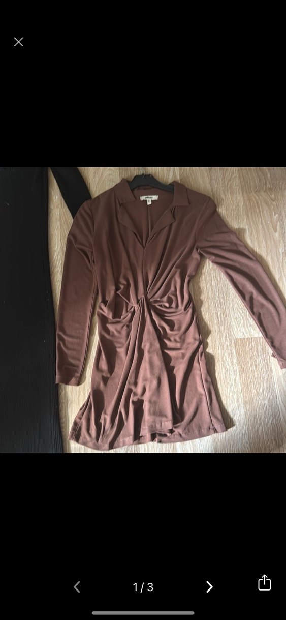 V yaka ve drapeli detaylara sahip, yumuşak sentetik kumaştan yapılmış, kahverengi uzun kollu dar kesim elbise. Ofis için uygun, minimalist sokak tarzı.