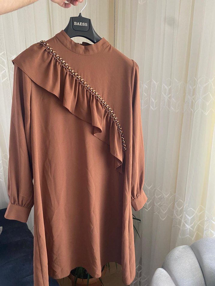 Uzun, bol kesim kahverengi tunik, yüksek yakalı ve önünde nakışlı fırfır detayı ile. Parlak, ipeksi kumaştan, günlük sokak stili için uygundur.