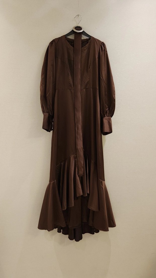 Koyu kahverengi uzun elbise, yüksek yakalı ve uzun kolludur. İpek gibi kumaştan üretilmiş, bol kesim ve fırfır detaylarıyla bohem tarzı yansıtır. özel dikimdir 1 kere giyildi
