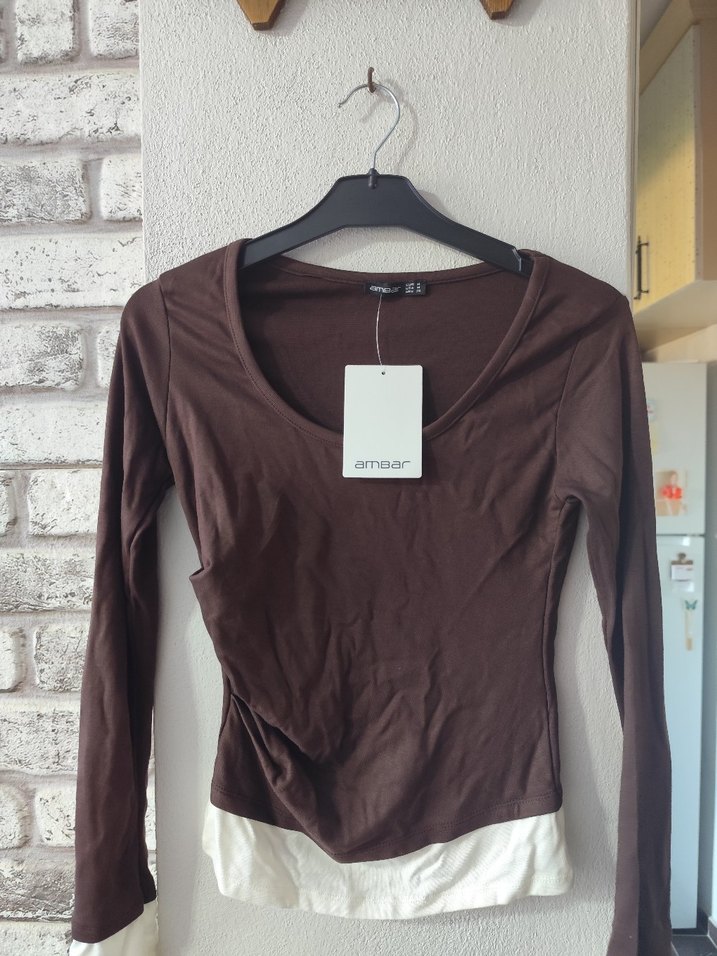 Uzun kollu, bisiklet yaka, kahverengi kadın bluz. Yumuşak keten kumaştan, minimal ve çağdaş tasarıma sahip, günlük kullanıma uygun şık bir parça. Bedeni küçük olduğu için satıyorum etiketi üzerinde hiç kullanılmadı.