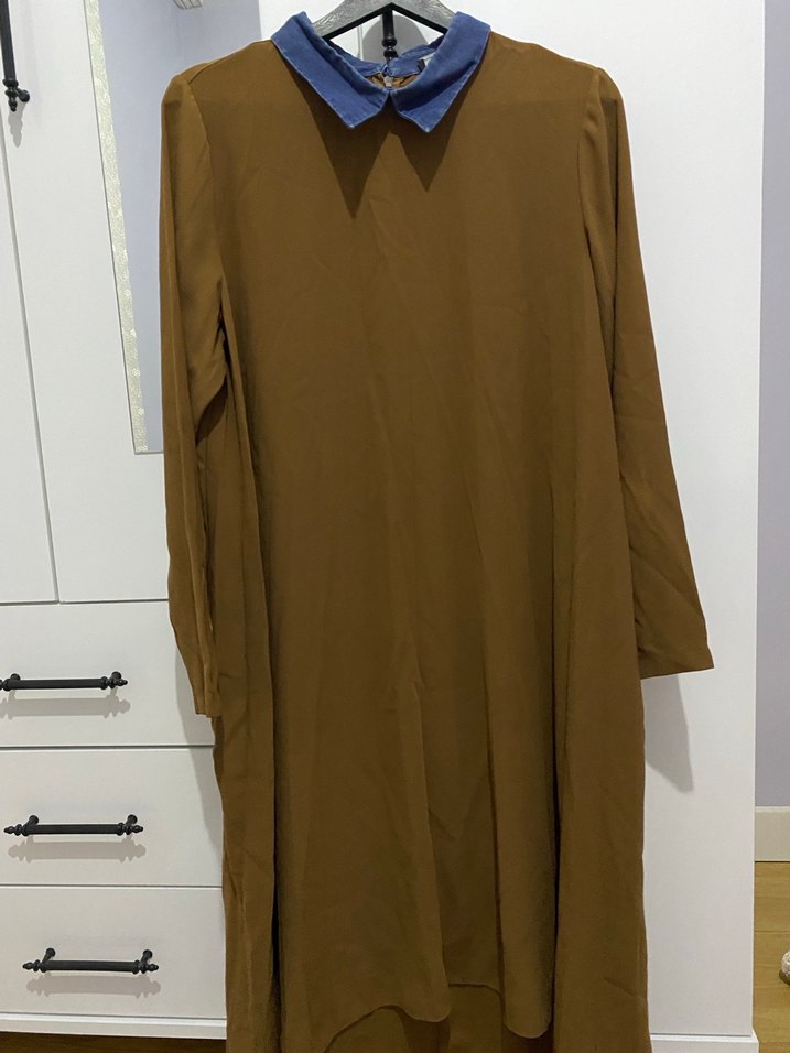 Sentetik kumaştan, uzun kollu, dökümlü kesime sahip, koyu bej renkte yakalı uzun tunik.