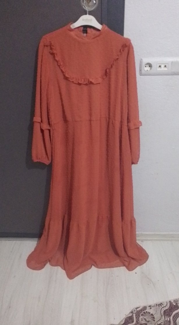 Bol kesim, uzun kollu ve yüksek yakalı uzun elbise. Yumuşak keten kumaştan yapılmış, kahverengi pastel renkte, fırfır detaylı rahat bohem tarzı.