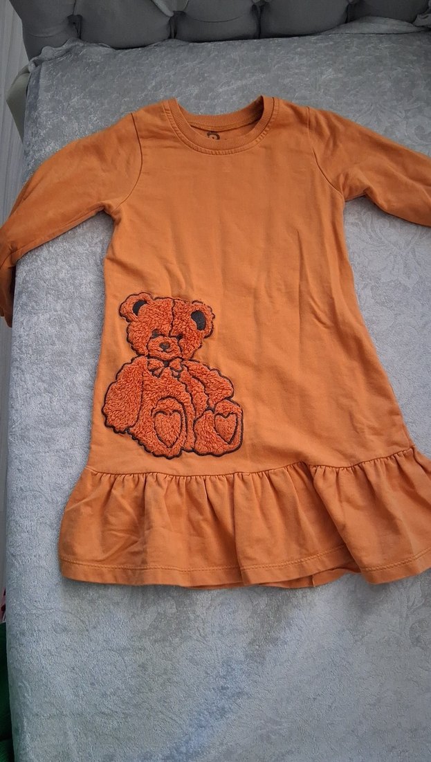 Yumuşak ve sıcak kumaştan, uzun kollu ve yuvarlak yakalı bol kesim kız elbisesi. Oyunlu görünüm için etek ucu fırfırlı ve nakışlı ayıcık detaylı.