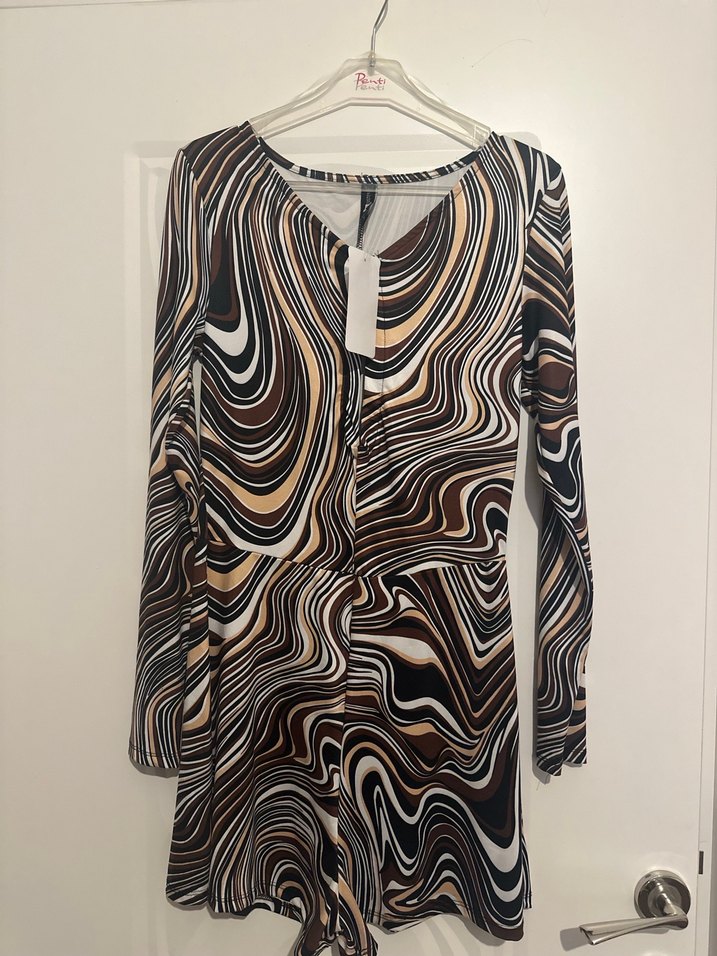 Kahverengi tonlarında uzun kollu, V yakalı, , kısa kesim ve vücuda oturan modern bohem tarzda tulum. Günlük kullanıma uygundur. ✨
