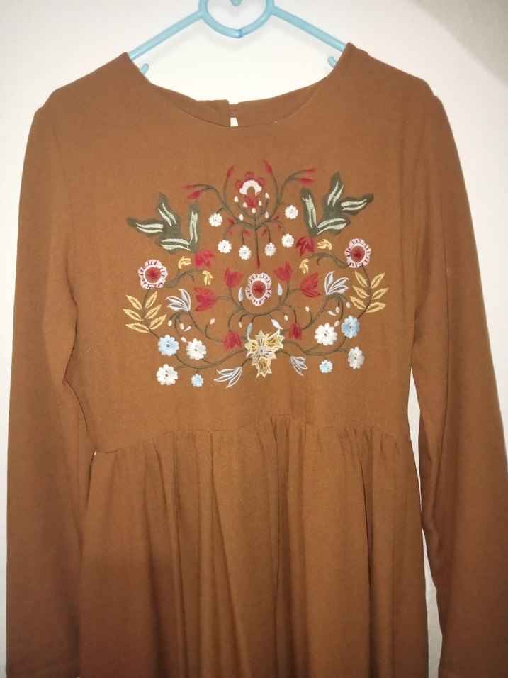 Kahverengi uzun elbise, nakışlı çiçek desenleri ve bel kısmında fırfır detaylarıyla geniş kesimdir. Uzun kollu ve yuvarlak yakalı, yumuşak dokulu kumaştan üretilmiştir.