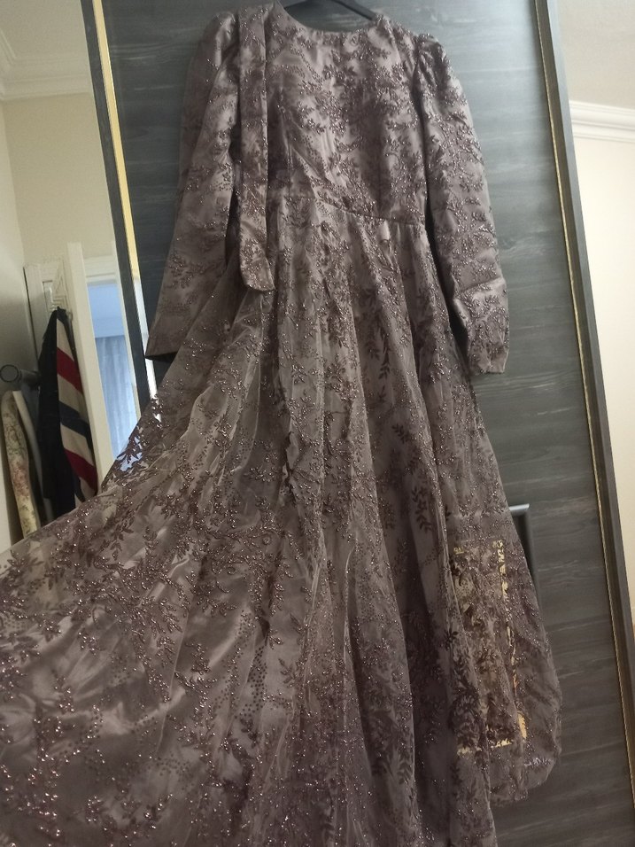 Nakışlı detaylara sahip uzun kahverengi elbise, drapeli tasarım, yaka kısmı kesikli ve uzun kolludur. Salaş kesimi ve vintage tarzıyla düğünlere uygundur. 42 beden yazıyor 40 L bedene tam uyumludur.